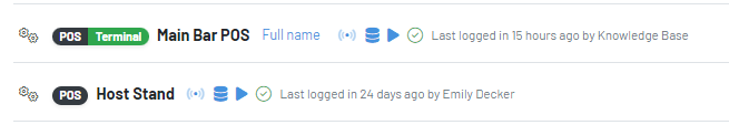 Below shows an example from the displays page in the GoTab Manager Dashboard of a POS configured as a terminal, and another as a non-terminal POS. In this example below, the Main Bar POS is configured to be paired to an NYC1 (we hit YES to Bluetooth device to be paired during activation) and is the device processing credit card payments. The Host Stand in this case is not configured as a terminal (we hit NO to Bluetooth device during activation). The Host Stand here is either a POS that is merely meant for order entry and guests do not pay here OR is connected to a CFD configured as a terminal whereby the CFD will process the credit card payments.