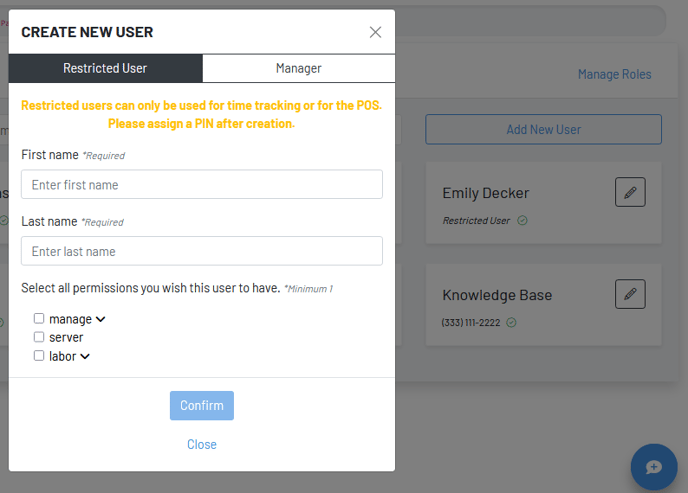 - Click confirm. If the new user is a manager they will be able to access GoTab by going to gotab.com/manager and verifying with their name and cell phone (entered exactly as you entered them into the system).