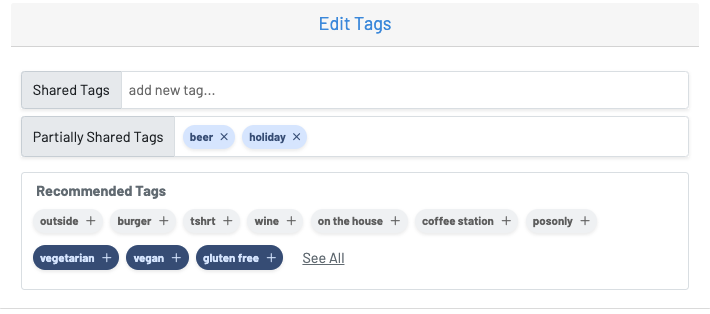 Then you can select your tags to apply to your categories. Tags you want applied to all products within the category you have selected will appear under “Shared Tags”. “Partially Shared Tags” are those tags that have been applied to some products within this category, but not all.