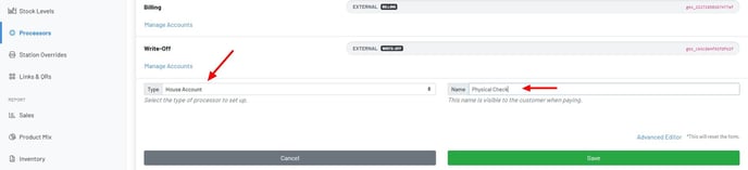 Note: Creating new processors (Gift Card, House Account etc.) requires both control:payments & control:location user permissions.