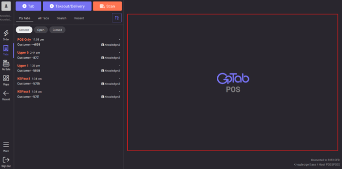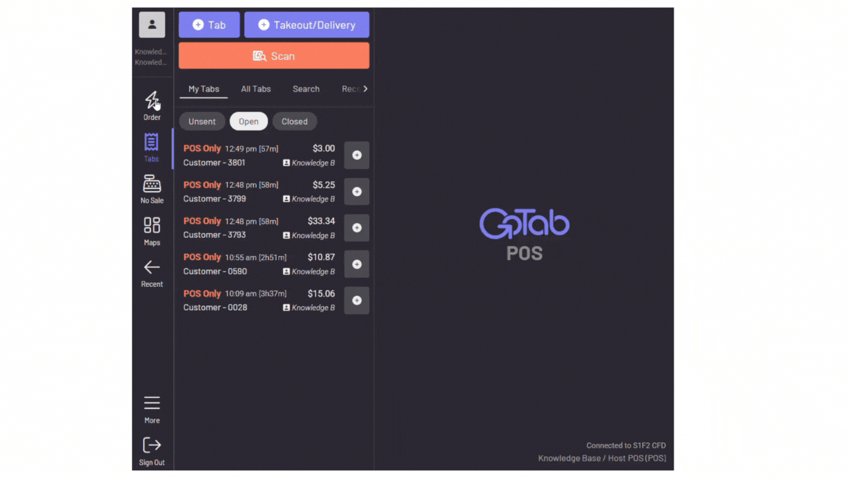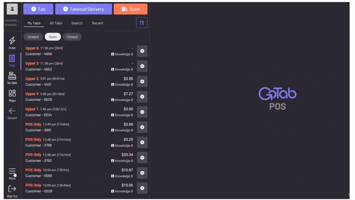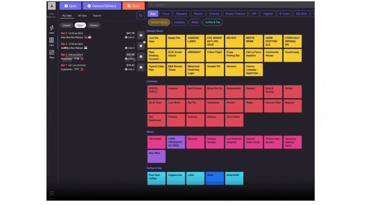 Tap the lightning bolt icon, choose a spot and you’re dropped into ordering. Utilizing +Tab would start a tab immediately, even if empty. The Quick Order functionality doesn’t technically create a tab until the order is initially sent, or a card authorization/payment occurs. Only then would it be listed as a tab, otherwise, it would still show under Unsent in your POS, rather than as an Open or Closed tab.