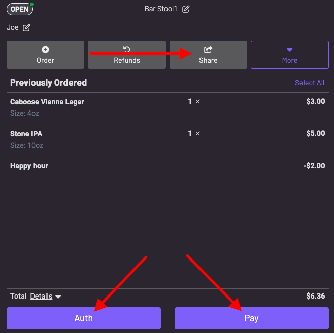 When the tab is open, you can ask the guest to pay with a physical credit card, authorize their card, or text them their bill to pay on their phone.