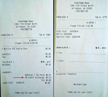 Printed itemized receipt reflecting the 3% credit surcharge with credit card signature slip.