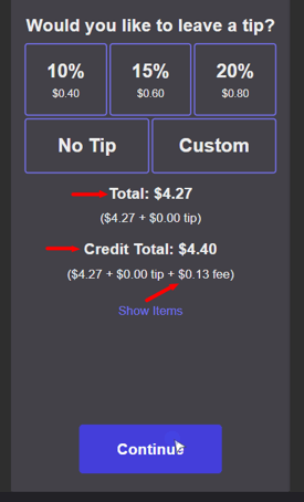 GoTab Customer Facing Display (CFD) reflecting the regular total, as well a credit total.