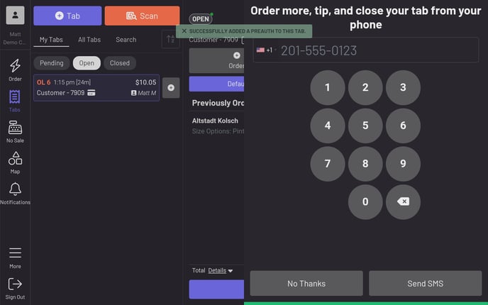 Once a guest verifies their tab, their ticket will become interactive for texting on the KDS.