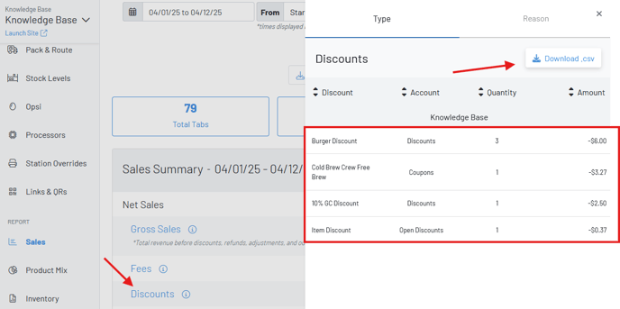 For example, below we click on our discounts line. We break out each discount and the amount discounted. At the top we can choose between discount type and reason. Click download CSV to view a report with links to tabs for each discount applied during the selected date range.