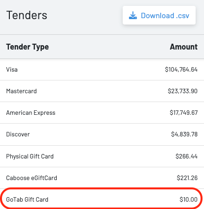 On the **sales **page, when a gift card is spent gift cards will appear as a tender type. In addition, operators can assign the gift card product a revenue account to properly account for all gift card sales.