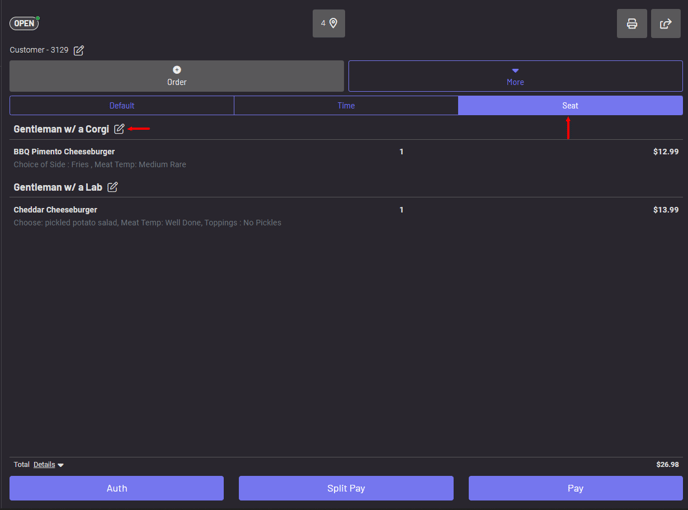Within the “Seat” view on a tab, click the edit icon on the seat to add a name to the seat to help keep your orders within a tab organized.