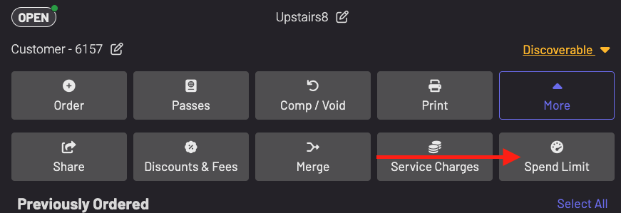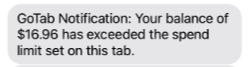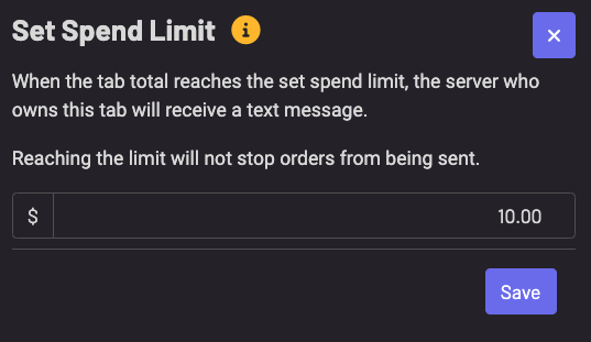 You can set a spend limit on a tab to notify the server when the limit is hit. The spend limit will not stop orders from being sent. For a server to receive a text about the spend limit, they must have the contact: spend limit permission and be an unrestricted user.