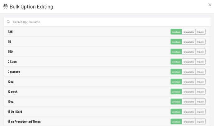 Choose “Options Availability” which allows you to easily mark your modifiers Available, Unavailable, or Hidden. You can scroll or search for a modifier here.