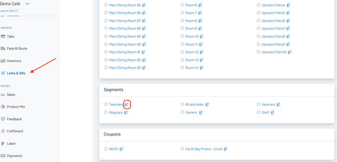 - Either print the QR for customers to scan or click the blue copy button next to the segment and embed the link in an email or send via sms