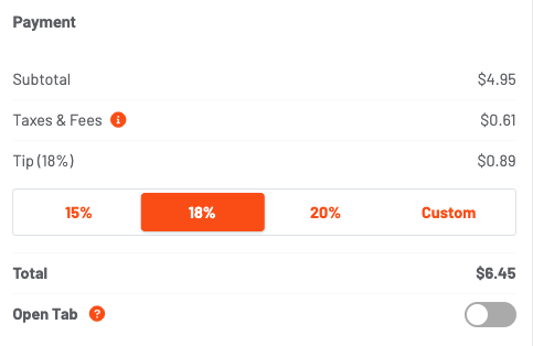 Regardless of your tip value, the subtotal, taxes & fees, and tip will be added together automatically and displayed in the “Total” row. You then have the option to choose a payment method before moving on to close the tab.