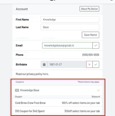 Please note that coupons are only redeemable from guest ordering/QR ordering. Coupons are not redeemable directly at a POS. A coupon lives in a guest’s GoTab customer account and any applicable coupon(s) automatically apply at checkout.