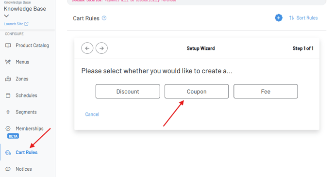 Navigate to Cart Rules in the manager dashboard. Click the **+add new discount/coupon/fee **button, and select coupon.