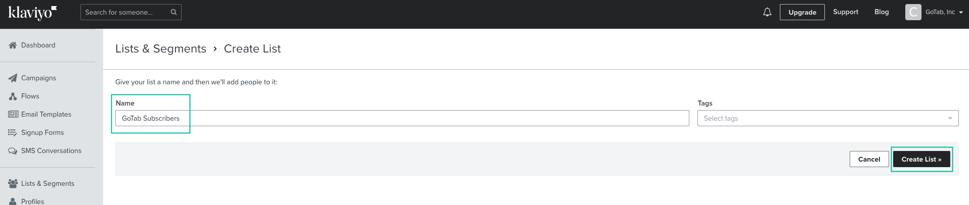 Now. you are ready to configure your list. **First name your list GoTab Subscribers **and select Create List