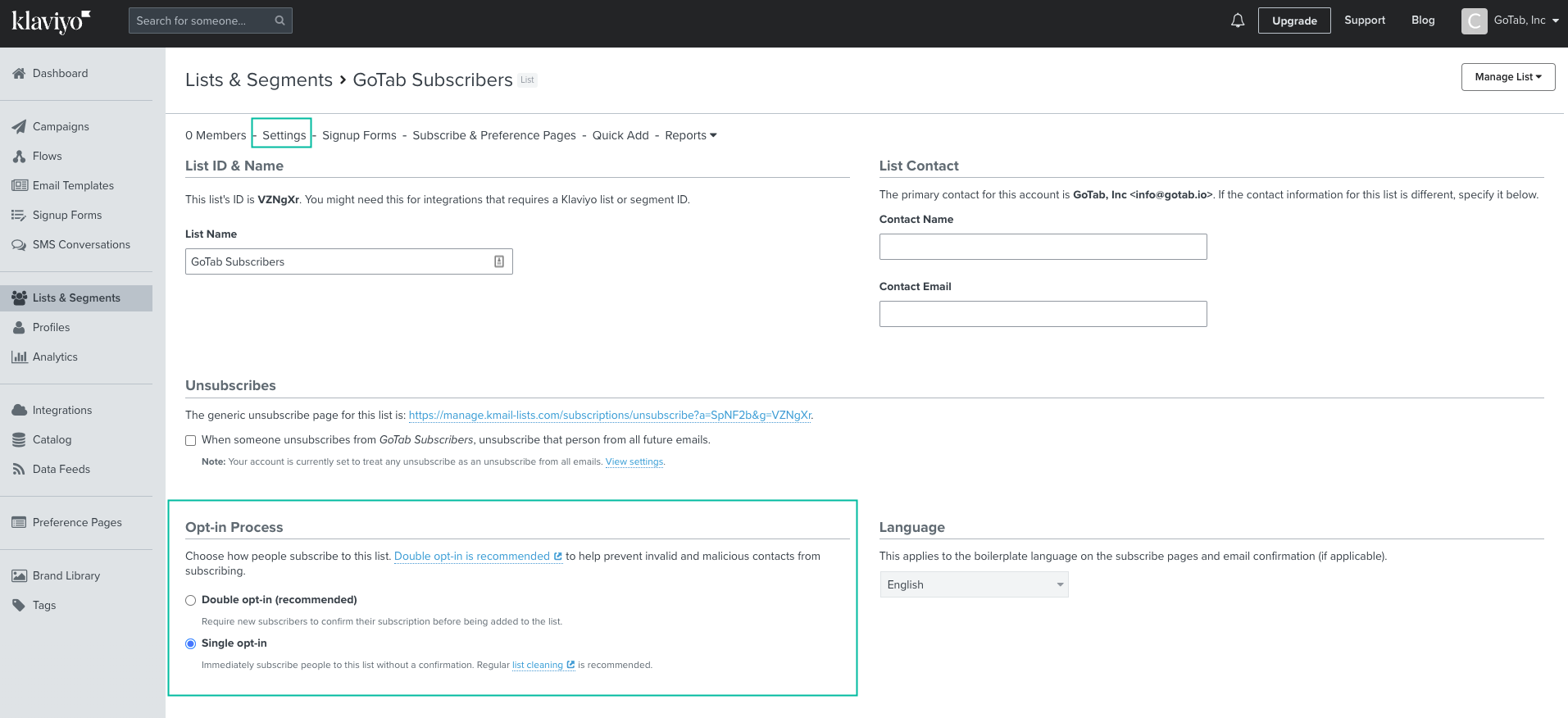 Once the list is created, select Settings. By default, every Klaviyo list is set for Double opt-in. GoTab recommends changing the list settings to single opt-in. This will help ensure your new subscribers are automatically added in Klaviyo without the requirement of confirming in a email that may be sent to a spam inbox.