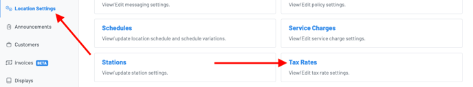 - Go to your “Location Settings” dashboard and click on “Tax Rates”