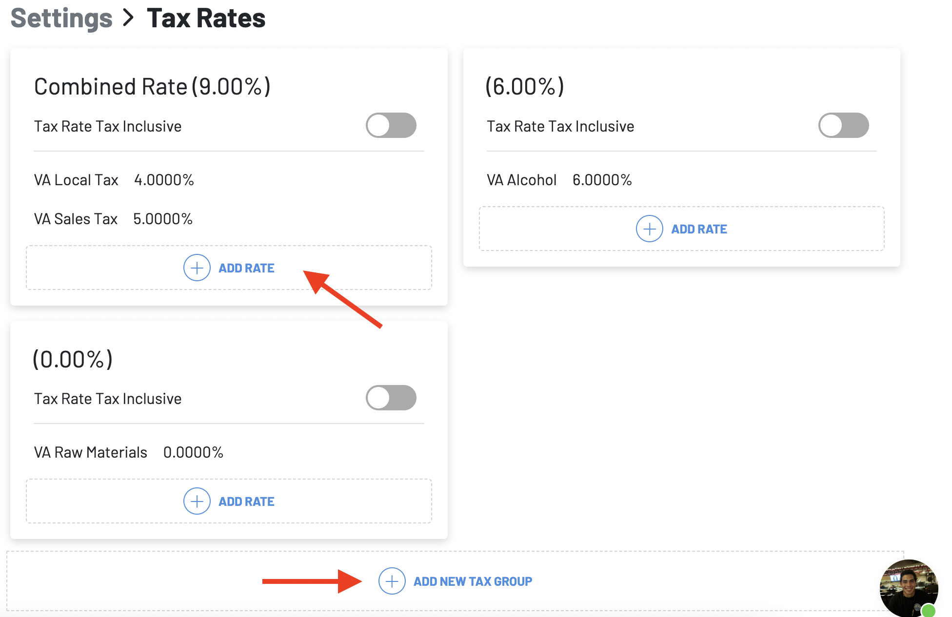 Click on the ”+ add new tax group” or “+add rate” on an existing group to add a new tax rate.