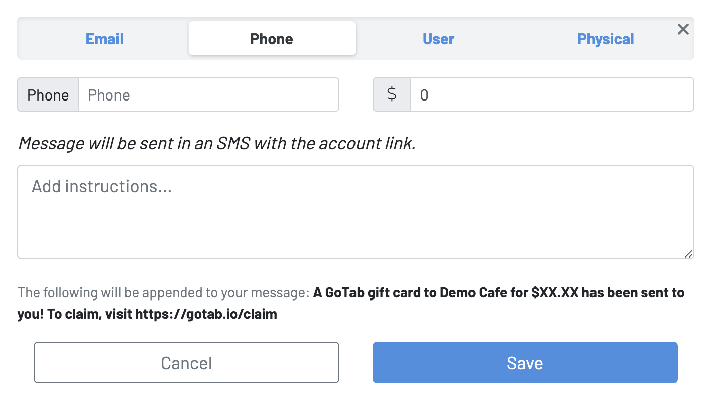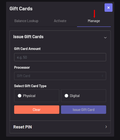 Note:** Issuing a gift card is when payment is not required by a guest. Click here to find out how to sell a gift card.**