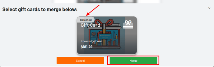 Once you click merge on the gift card, the other card will appear. Click each card you would like to merge (it will say selected in the upper left) and click merge.