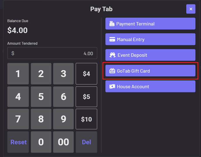 Section titled “Physical Gift Cards”To pay for a tab with a physical gift card, choose GoTab Gift Card as the payment method.