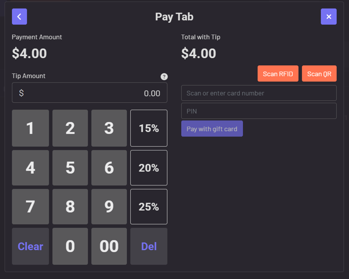 Section titled “Paying with a Digital Gift Card on the POS”If a guest wants to use their digital gift card to purchase a tab created by a server on the POS, they can do so.