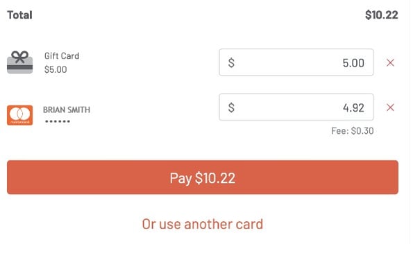 If the gift card does not cover the entire check balance, the guest must select, **“Or use with another card” **and a split payment modal will appear. The guest can choose which cards they wish to split payment across.