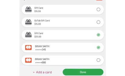 Section titled “Digital Gift Cards”When a user has a digital gift card on their GoTab account, they will have the option to apply their gift card balance. Gift cards cannot be used to open a tab, however, once the tab is open and the guest is ready to pay they can apply their gift card balance. A payment will deduct from the gift card balance. Gift cards with $0.00 balance are removed.