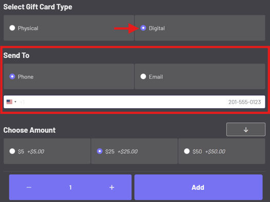 3. Choose whether you want to send the digital gift card via Phone or Email and input the appropriate information for the recipient.