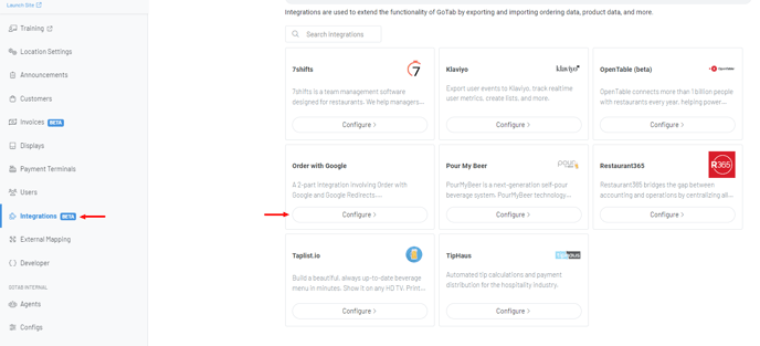 - Navigate to the Integrations Page and Configure “Order With Google”.