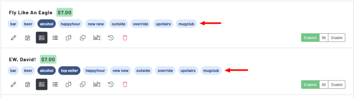 -In our setup here, since we have items that will be discounted with a membership, we first want tag the corresponding items in our product catalog. Here, we tagged both Fly Like An Eagle and EW, David! with our Mug Club tag.