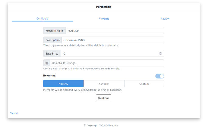 Program name is what you’d like to name the membership program. This, along with the description, will be visible to your guests in their GoTab account.