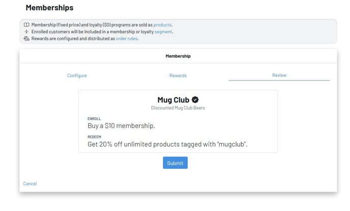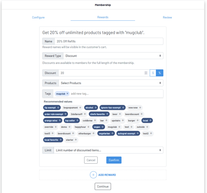 In the example below, we’re setting up a Mug Club Membership where members will receive 20% off of all Mug Club items with an active subscription charged a recurring $10 per month.