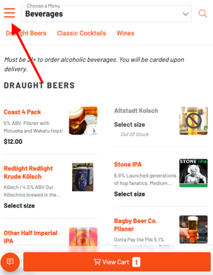 - **Share Tab via text or QR - **Once you have an open tab and are browsing the menu, click the 3 horizontal lines in the top left of your screen to open the categories/menus view: