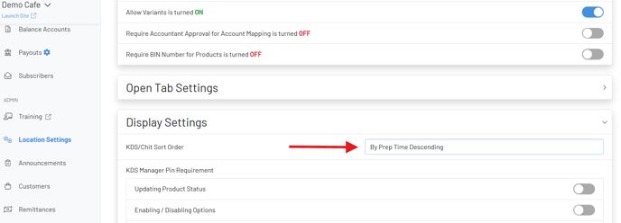 You will then scroll down to Display Settings > “KDS/Chit Sort Order”