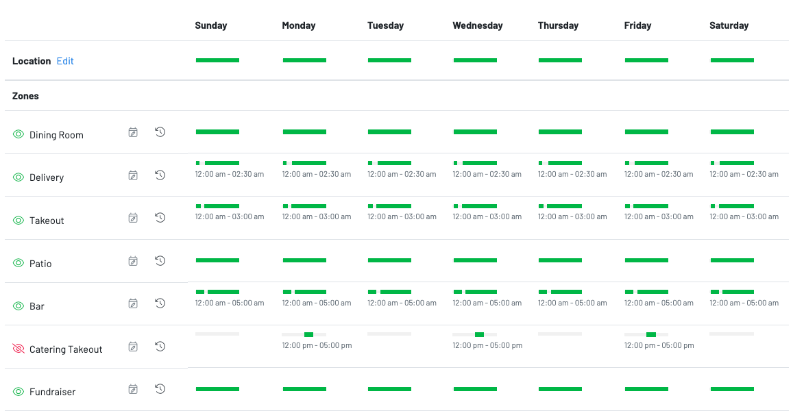 You will notice there is a section to view your zone and menu schedules. This will help you compare the two schedules to ensure there are no time conflicts. The “eye” icon on the left of your schedule lets you know if the menu or zone is searchable.