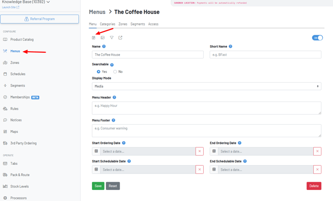 For Takeout/Delivery Holiday or Special Menus that may be available for limited dates, you can also set beginning/ending ordering dates, controlling when this menu will be available to order from. You can also set when a guest can schedule pickup for an order from this menu by adding a date range to start & end schedulable dates.