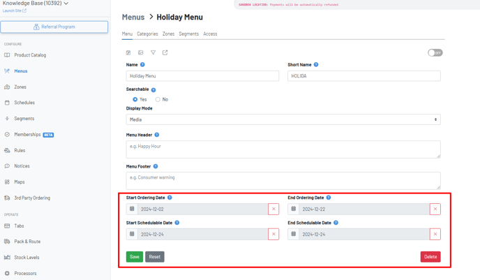 In this example, guests can start placing orders from this Holiday Menu on December 2 and the last day they can place an order is December 22. The only available schedulable day is December 24 which means guests are ordering from this Holiday Menu 2nd-22nd but only for Takeout/Delivery on December 24.