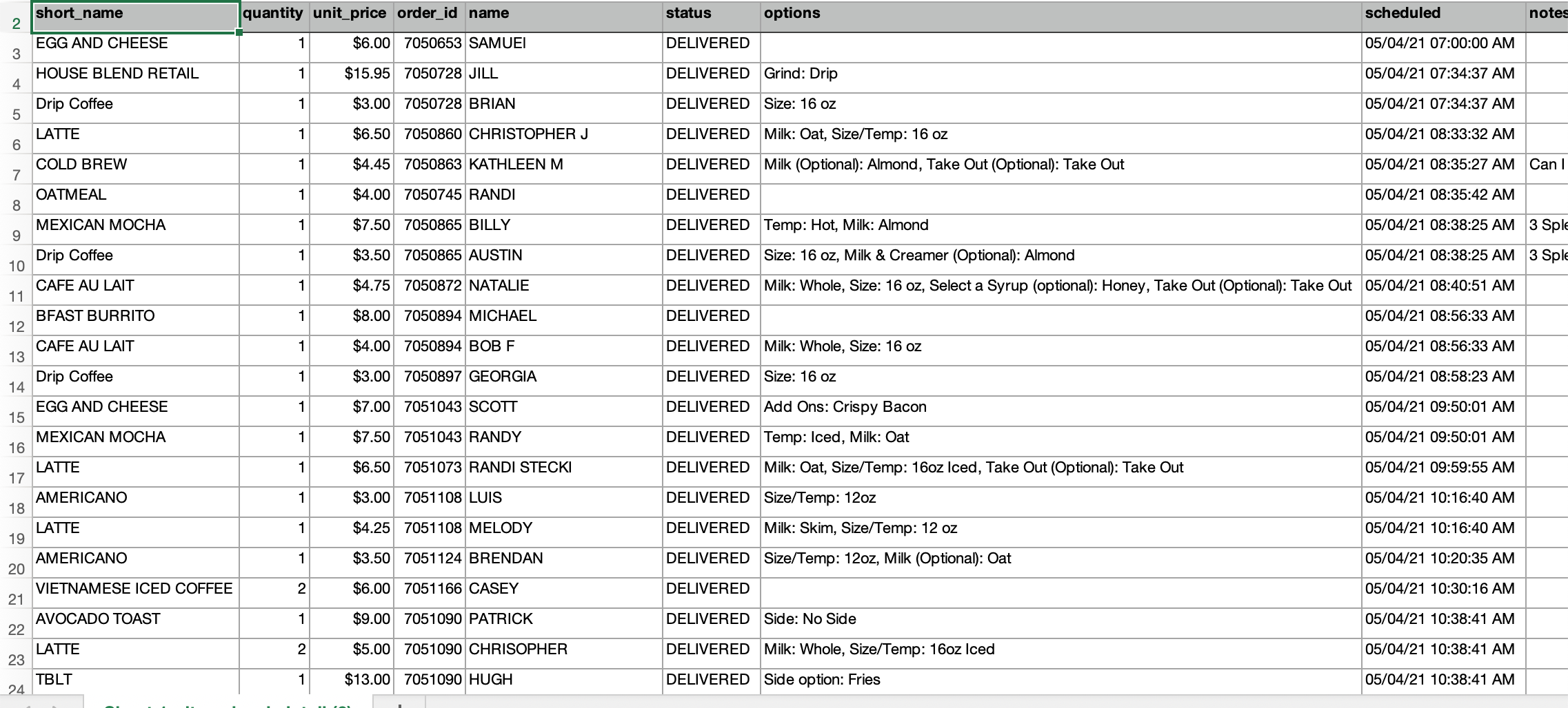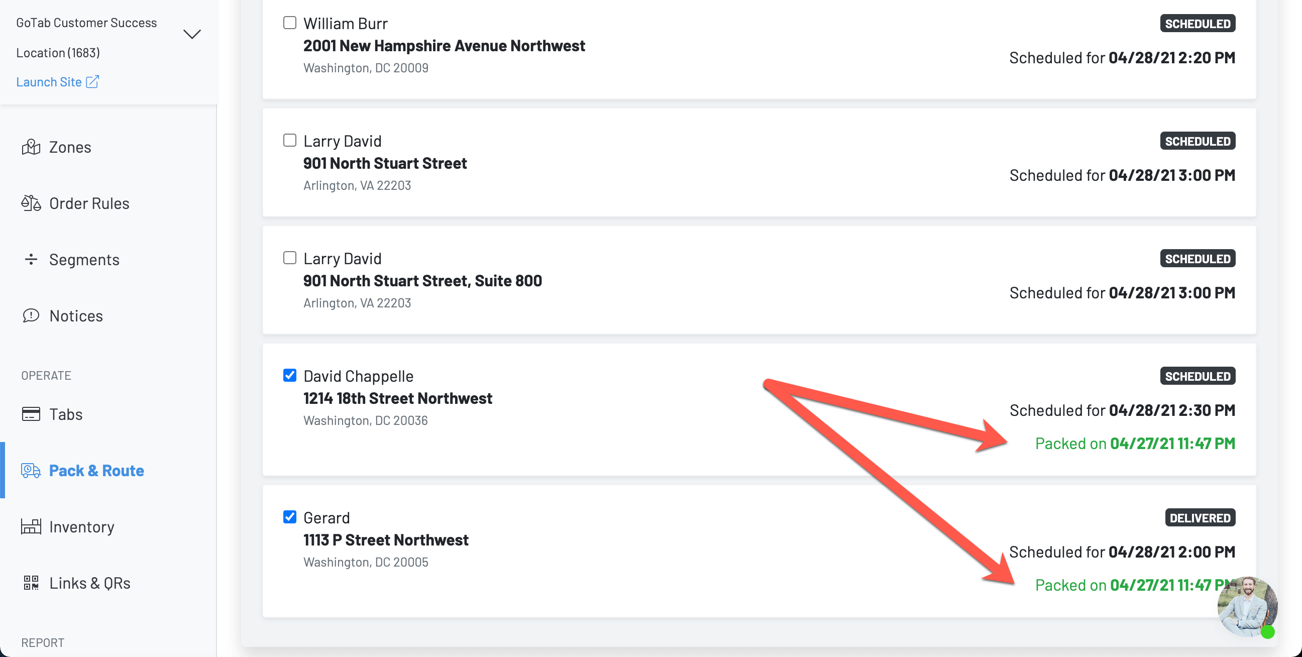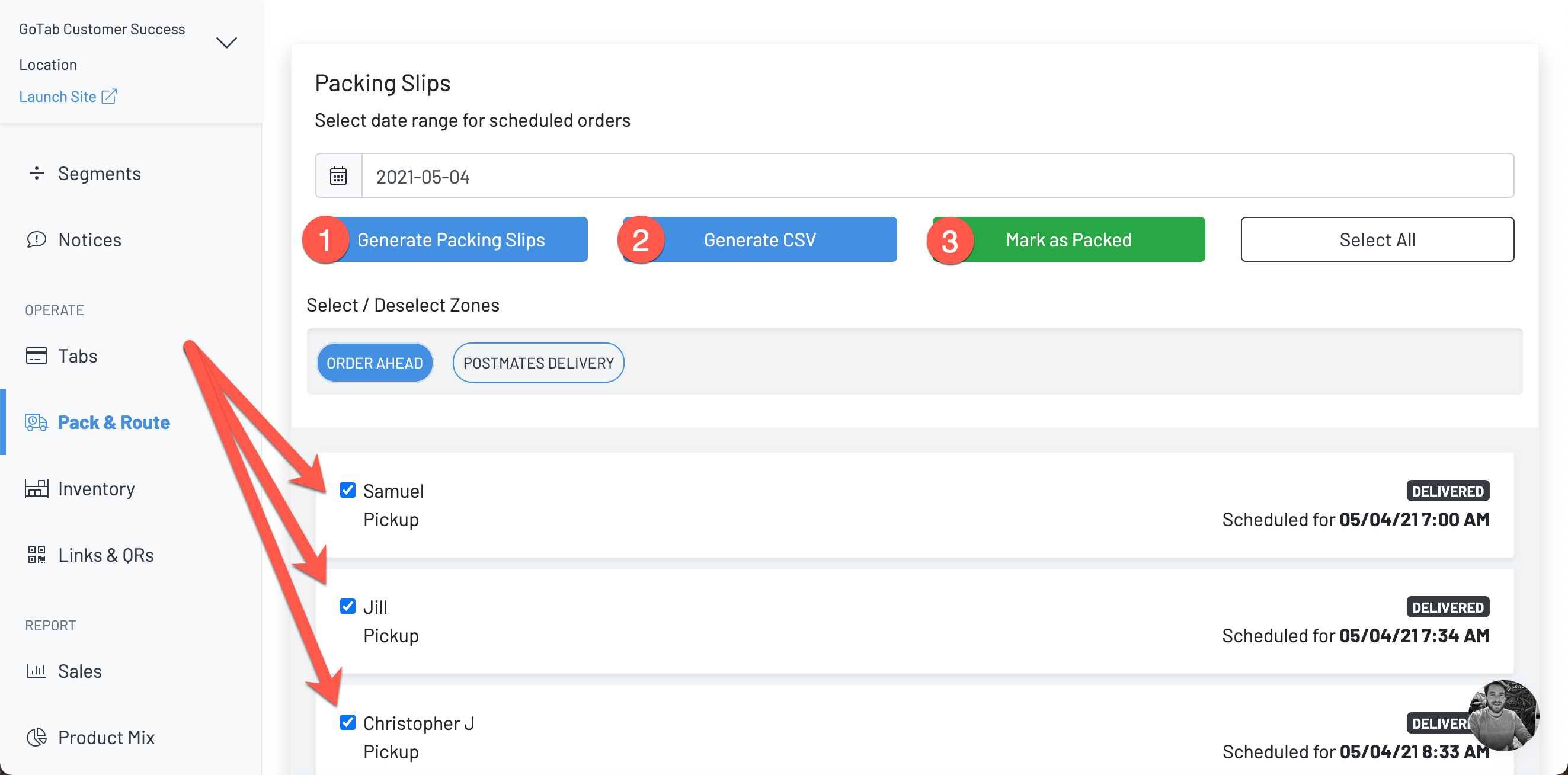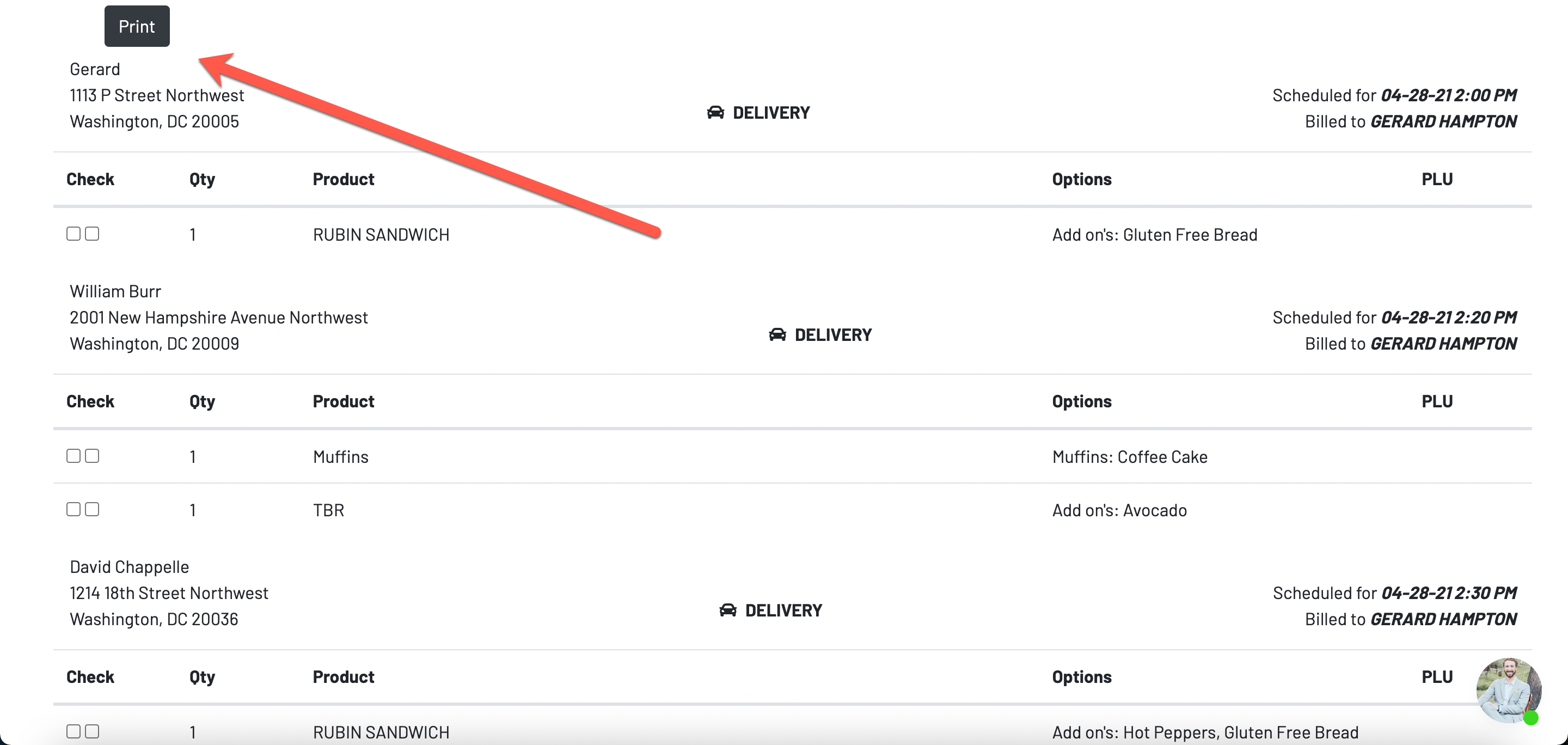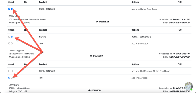 After clicking “Generate Packing Slips” you will see the selected orders, name of the guests on the orders, delivery locations (if applicable), scheduled for dates, and products and modifiers. You are able to use this digital view to check products as you fulfill them: