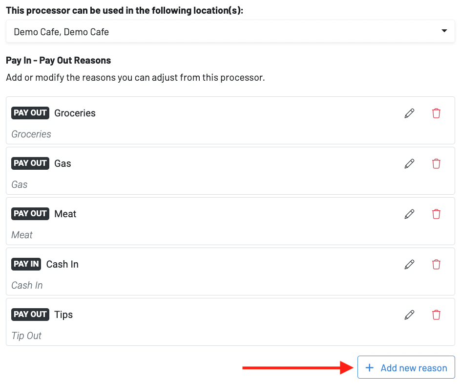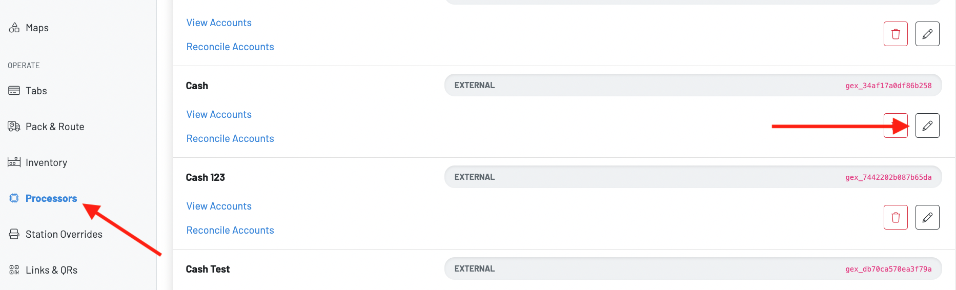 Click the pencil icon next to your already-created cash processor