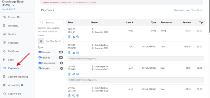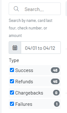 On the left side of the payments page, you can search search by card number across a date range and filter by success, refunds, chargebacks and failures.