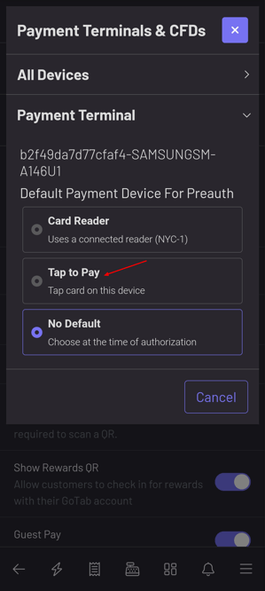 -Set “Tap to Pay” as the “Default Device for Preauth”.