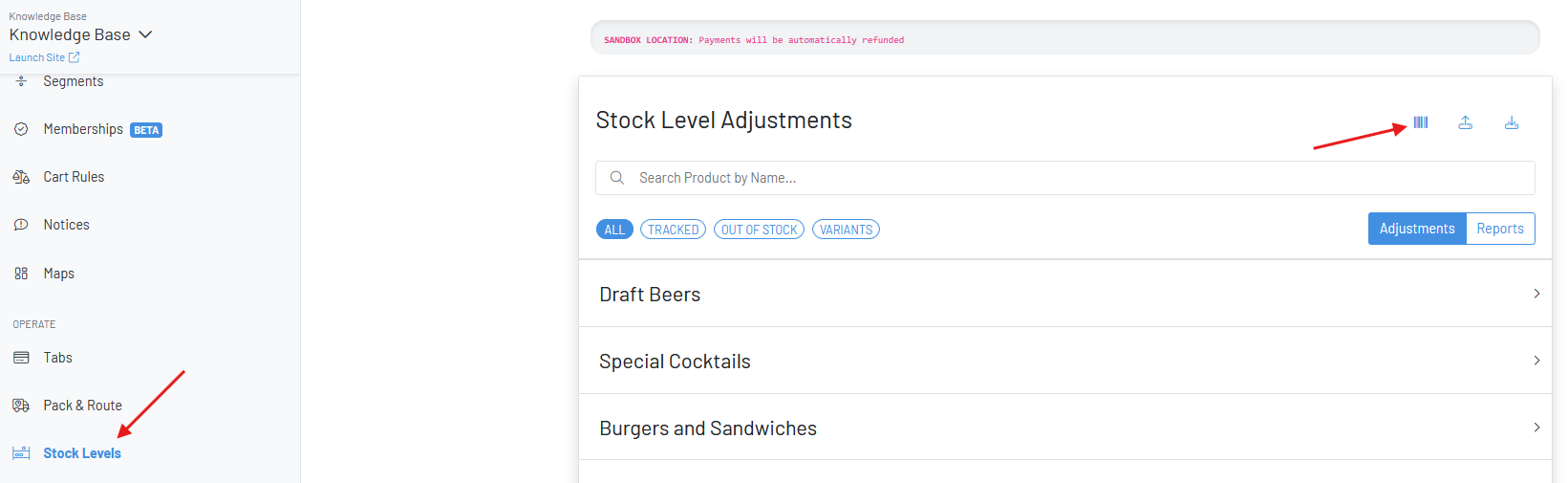 Click the barcode icon on the Stock Levels Page of the Manager Dashboard.