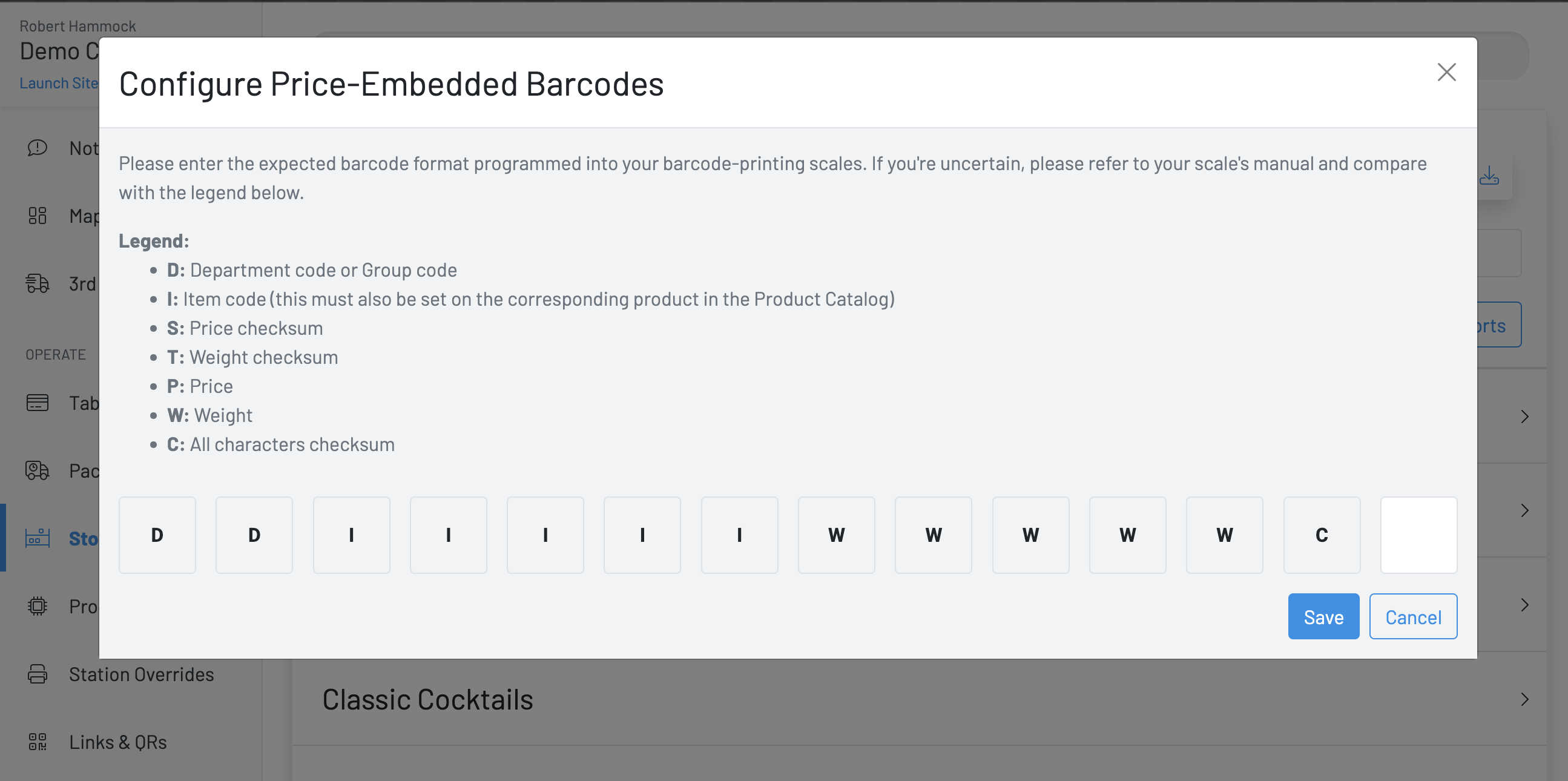A modal will appear prompting you to enter the “barcode mask” we should expect when scanning one of these barcodes on the POS or Kiosk. Each of these letters corresponds to a number in the barcode. For now, this feature is only concerned with the Item Code, Price, and Weight characters. Often the mask will only include Item Code, and either Price or Weight due to character limitations (typically 13 digits in the barcode)