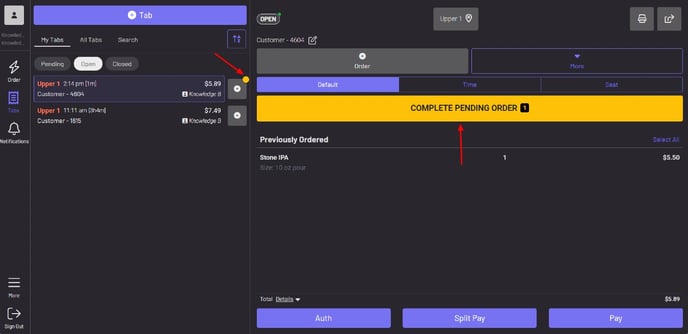 Section titled “UI Update”We recently added a yellow indicator in the POS to alert a server when an already open tab has an order that is still pending. This icon does not show on entire tabs that are still pending, but rather on already open tabs that have an order that has not yet been sent.