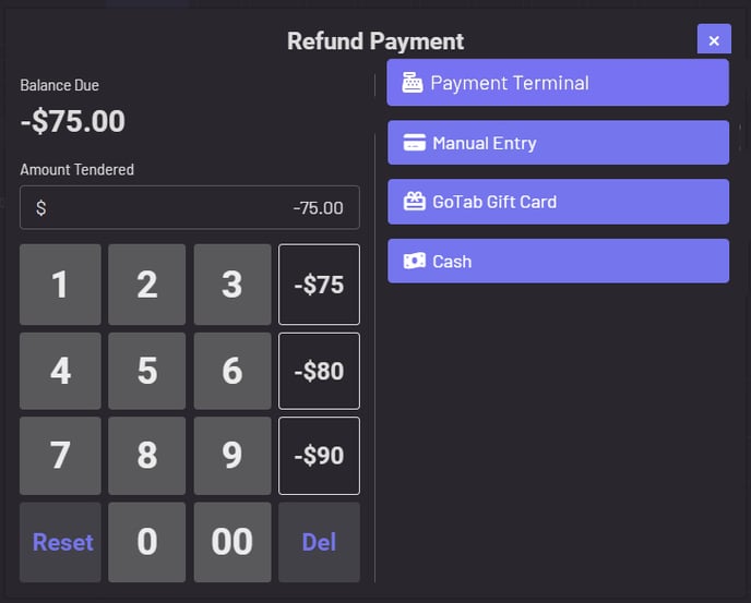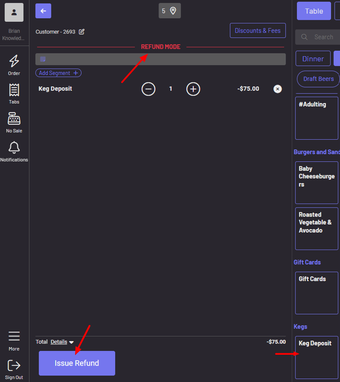 Note: Tabs entered and processed back via refund mode do not show as adjustments, discounts or refunds on your sales page. You’re creating a new tab and crediting the amount back to a guest, which is different than choosing an already existing tab and refunding.