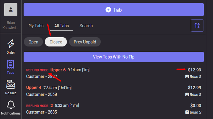 Once you’ve issued payment back, refund mode tabs are noted in red under your closed tabs.
