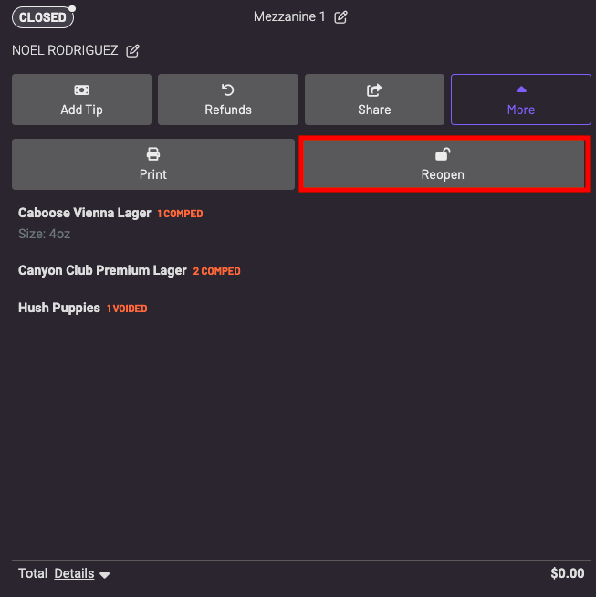 Tabs can be reopened from the Tabs dashboard and from the POS. The tab can either be reopened directly (balance due will be $0.00) or by open refund (balance due will be the amount of the open refund).