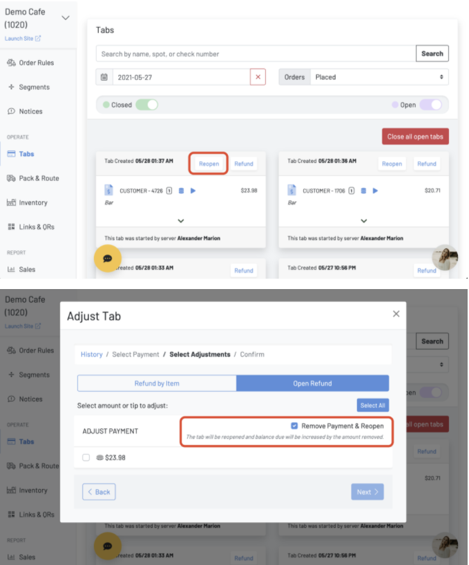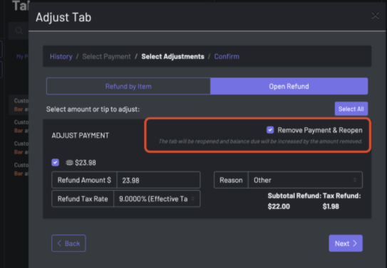 Section titled “Tabs can be reopened while removing a payment (or a portion of payment) during an open refund.”