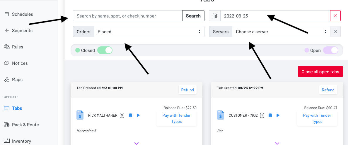 The *search bar *on the tabs page allows you to locate a guests’ tab seamlessly. Simply search by using the guests’ first and last name, check number, or the spot (table number) at which they dined. You can also filter for a custom date range, switch between orders placed or scheduled, and even choose a server.